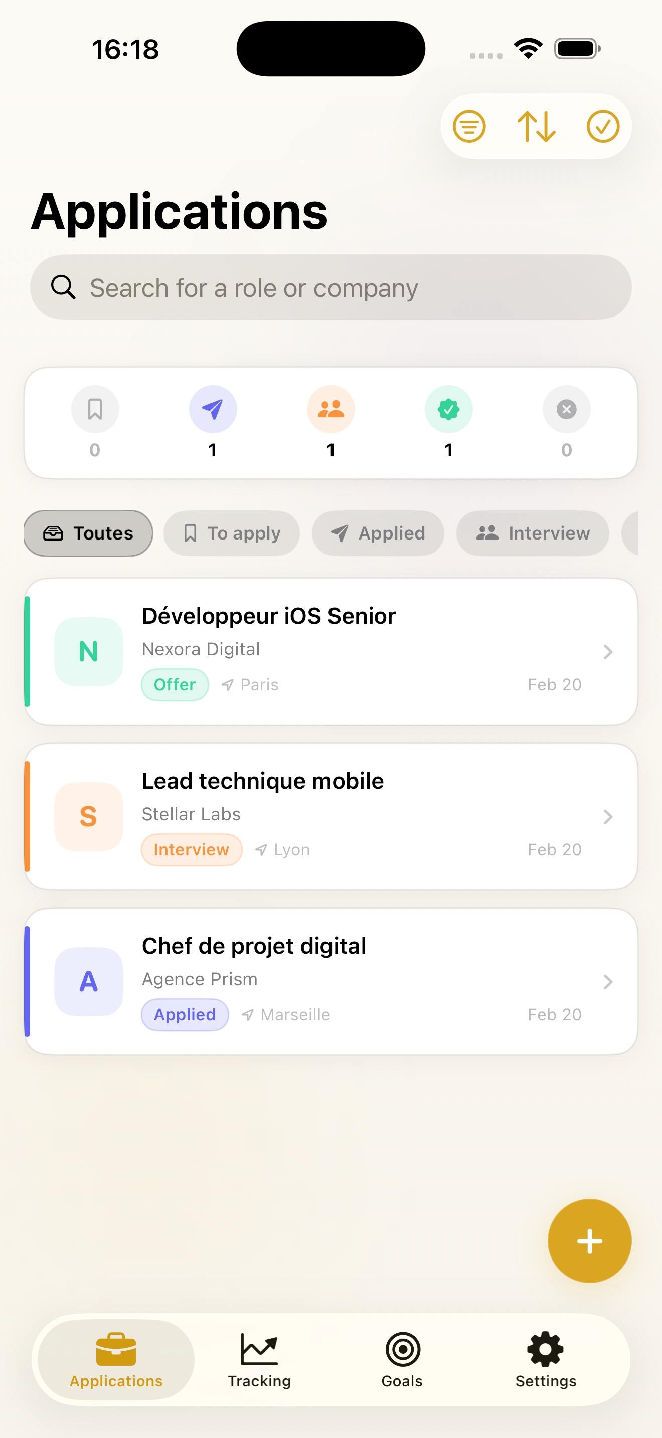 Add applications manually or in one tap via the share sheet from Safari or LinkedIn. For each application set a status, add recruiter contact details, notes and a follow-up reminder — one-off or recurring — and Hiry will remind you until the status changes. Use the dashboard, calendar, and widgets to see progress and upcoming follow-ups at a glance.